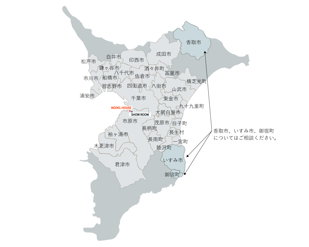 市原市、千葉市、松戸市、白井市、印西市、八千代市、船橋市、市川市、君津市、袖ヶ浦市、木更津市、茂原市、大網白里市、東金市、四街道市、成田市、横芝光町、山武市、酒々井町、冨里市、浦安市、九十九里町、白子町、長生村、一宮町、佐倉市、八街市、習志野市、長生郡(長柄町・長南町・睦沢町)とさせて頂いております。