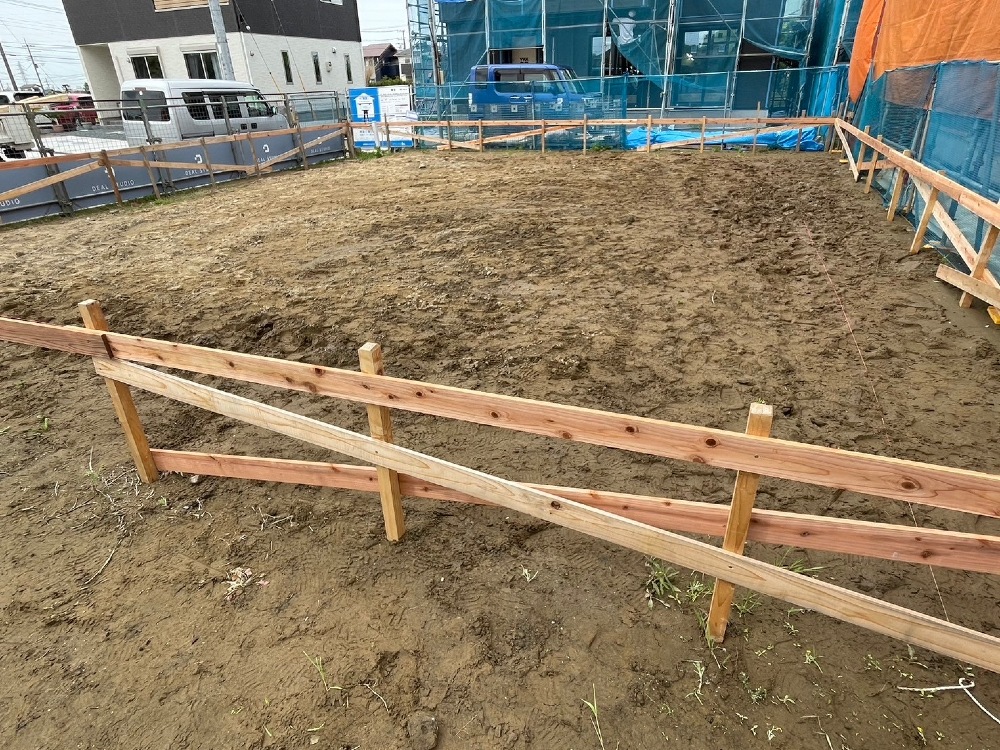 根切り→砕石→防湿フィルム→捨てコンの流れで工事が進みます。